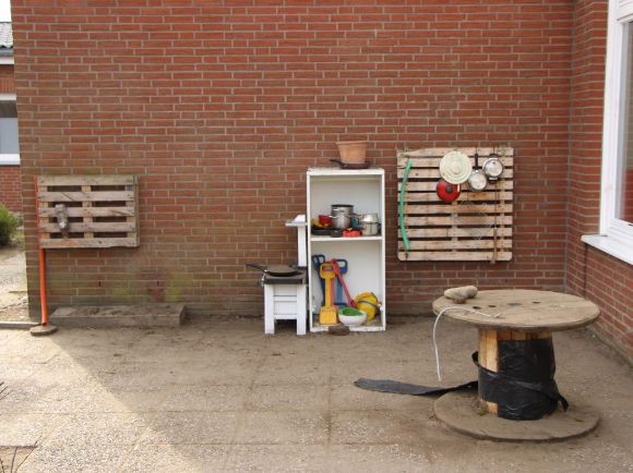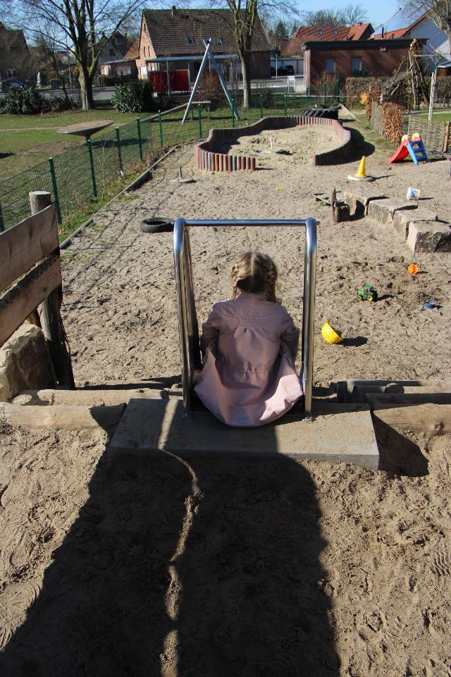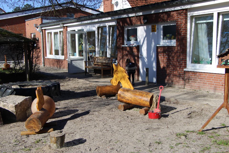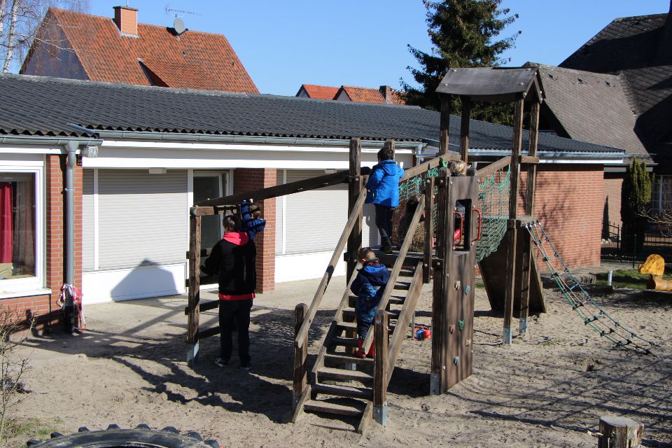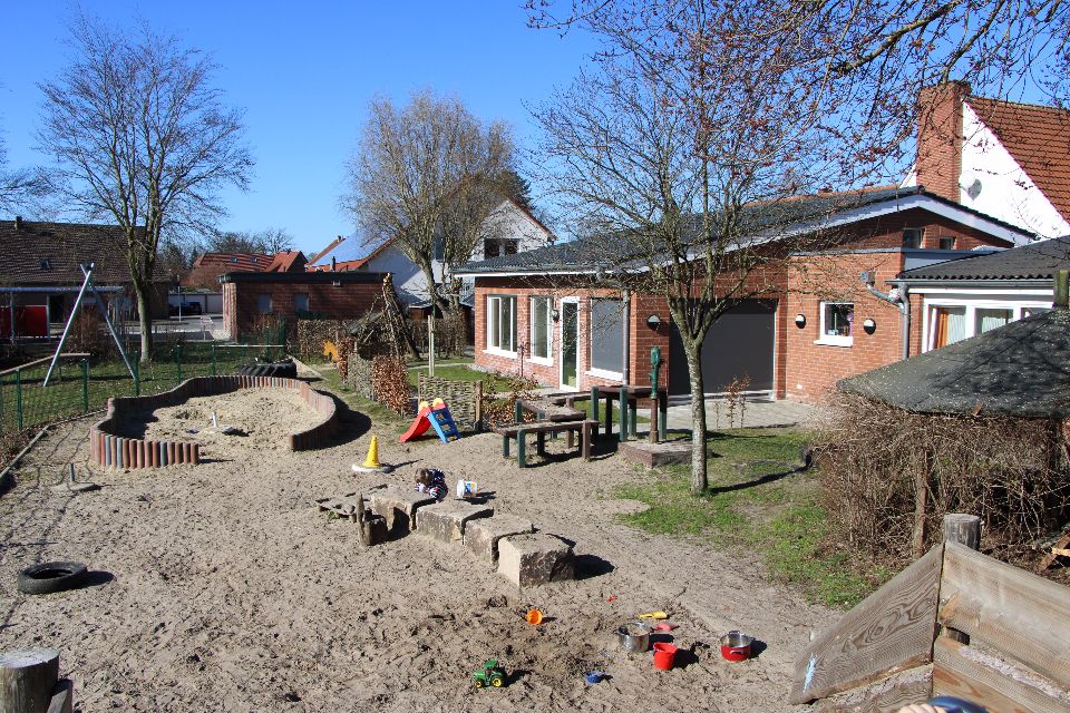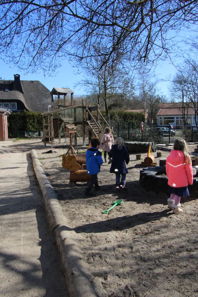 Durch den Anbau einer vierten Gruppe im Jahre 2018 hat sich unser Außengelände zwar verkleinert, jedoch verfügt es über vielfältige Angebote, die für Kinder reizvoll sind: Klettergerüst für die älteren Kinder, ein kleines Klettergerüst für die jüngeren Kinder, tierische Sitzgelegenheiten, ein steiniger Hügel zum Rutschen, Klettern und Durchkriechen, eine Wassermatschanlage, ein Sandkasten, ein Barfußpfad, Hecken zum Verstecken, eine Bobbycar-Rennstrecke, sowie eine geteerte Fläche für Fahrzeugrennen aller Art oder zum großflächigen Malen mit Straßenkreide.