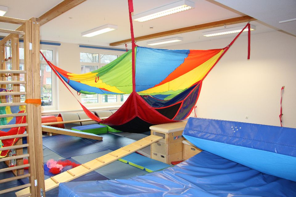 In unserer eigenen Bewegungshalle bieten wir täglich unterschiedliche Bewegungsangebote an. Die Kinder können sich in Bewegungsbaustellen erproben, im Bällebad entspannen oder austoben sich beim Klettergerüst in die Höhe wagen, oder rhythmischen und tänzerischen Angeboten begegnen. Unser Flex-Schwebetuch lädt zum Träumen, Fliegen und Schaukeln ein.